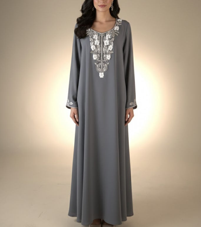 This elegant Gray Jalabiya features a sophisticated design with intricate white embroidery adorning the neckline and cuffs. Made from soft, flowing fabric, the garment offers a comfortable loose fit that drapes gracefully over the body. The classic gray color is enhanced by the delicate floral embroidery pattern, creating a perfect balance between simplicity and refinement. Ideal for daily wear, home gatherings, or casual outings, this versatile jalabiya combines traditional styling with contemporary comfort.