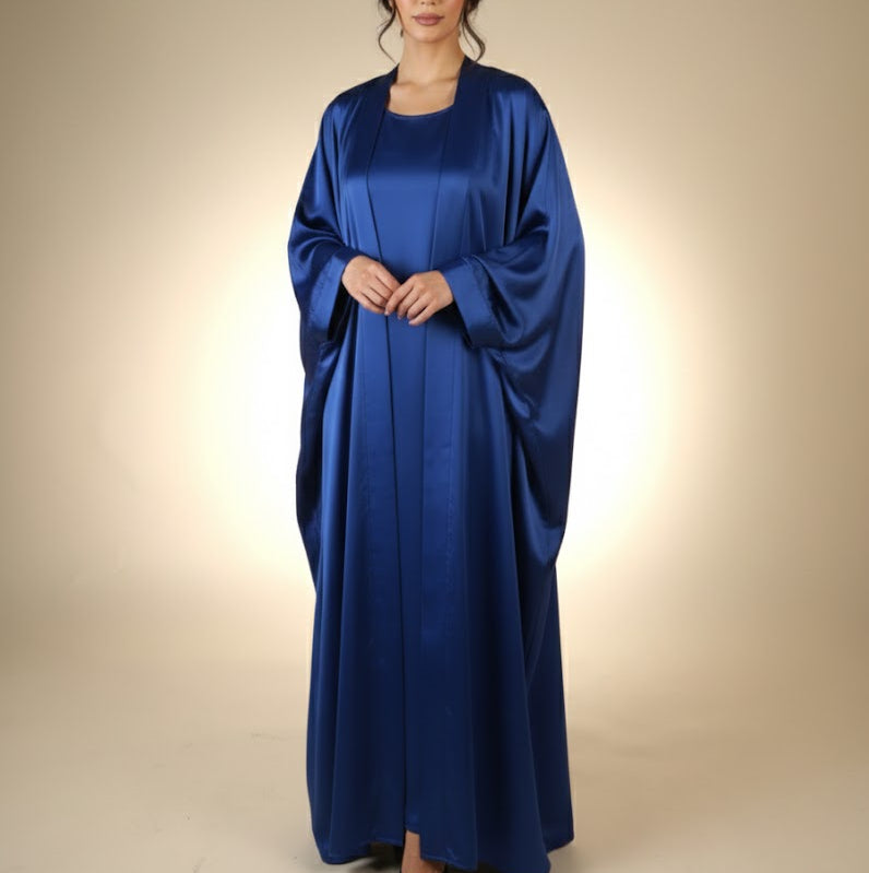 This luxurious two-piece set is crafted from high-grade cobalt blue satin, offering a brilliant luster and a smooth, liquid-like drape. The ensemble features a sleeveless inner slip dress paired with a floor-length, open-front outer robe designed with graceful batwing sleeves and refined cuff detailing. Its vibrant jewel tone and minimalist silhouette make it a standout choice for formal occasions, providing a perfect blend of modest coverage and high-fashion elegance.