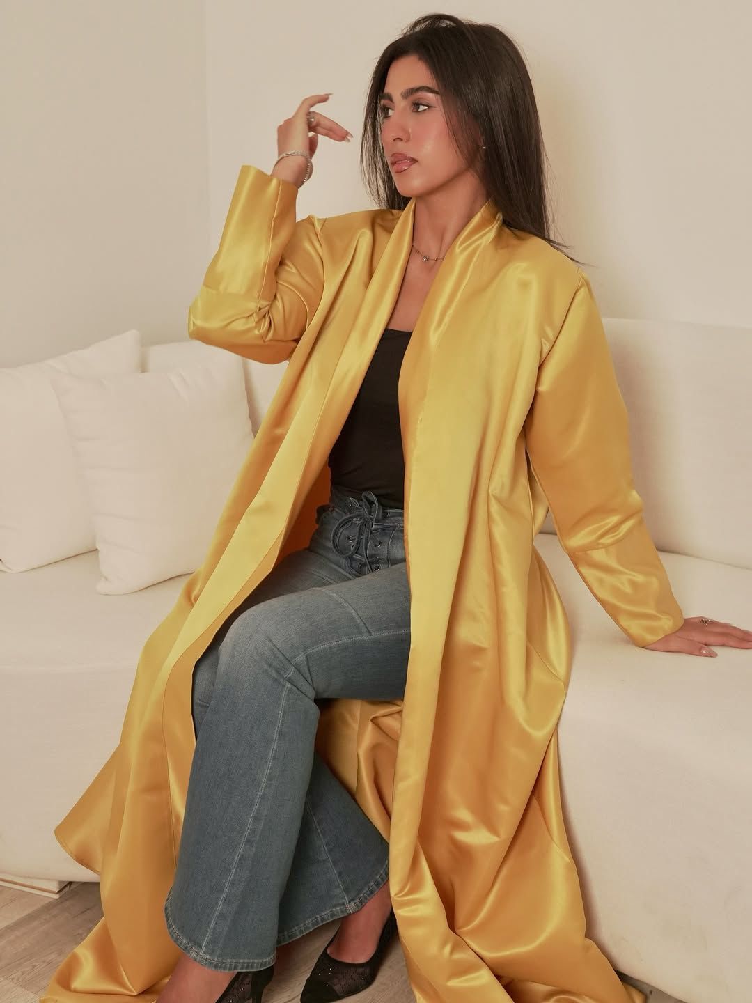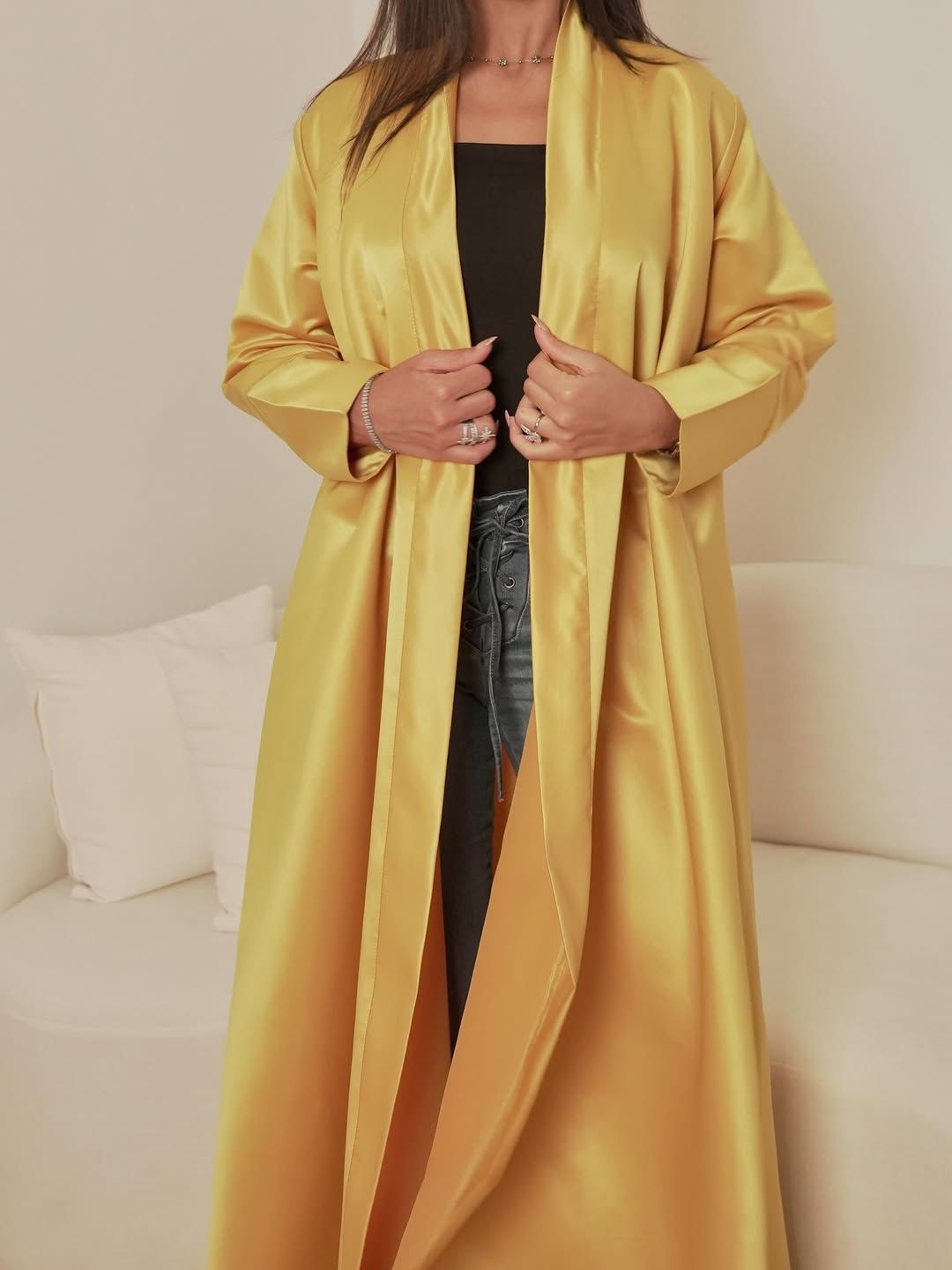 An opulent, floor-length abaya crafted from high-shine gold satin that captures and reflects light beautifully. This statement piece features a clean, open-front design with structured lapels and long, elegant sleeves. The fluid drape of the luxury fabric provides a rich, liquid-like silhouette, making it an ideal choice for high-end evening events or special occasions.