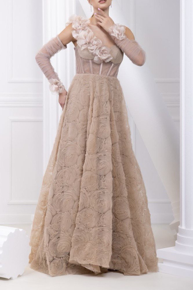 BEIGE DRESS WITH GLOVES