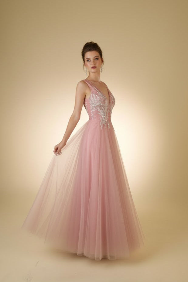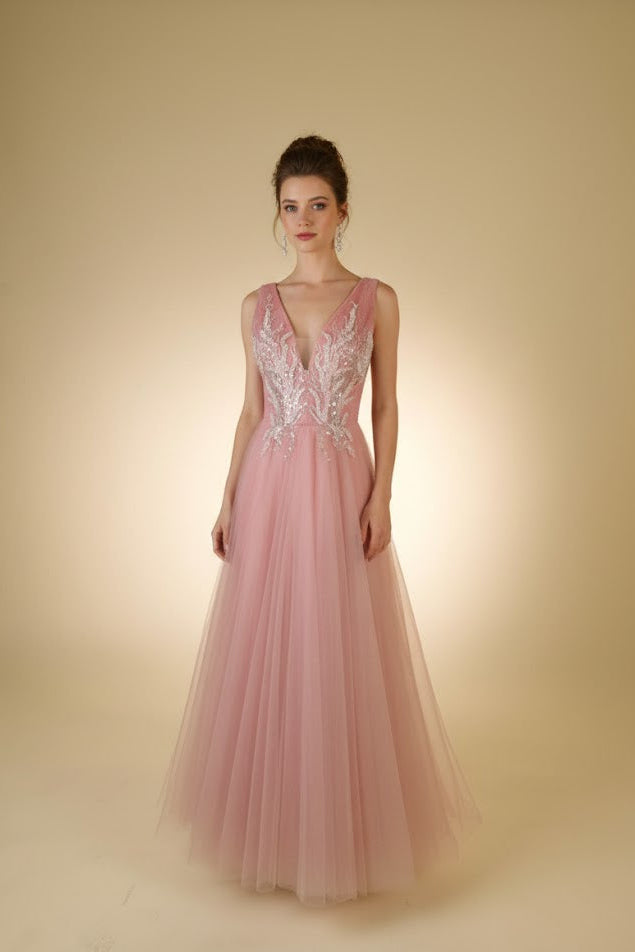 Blush V-Neck Embellished Tulle Gown