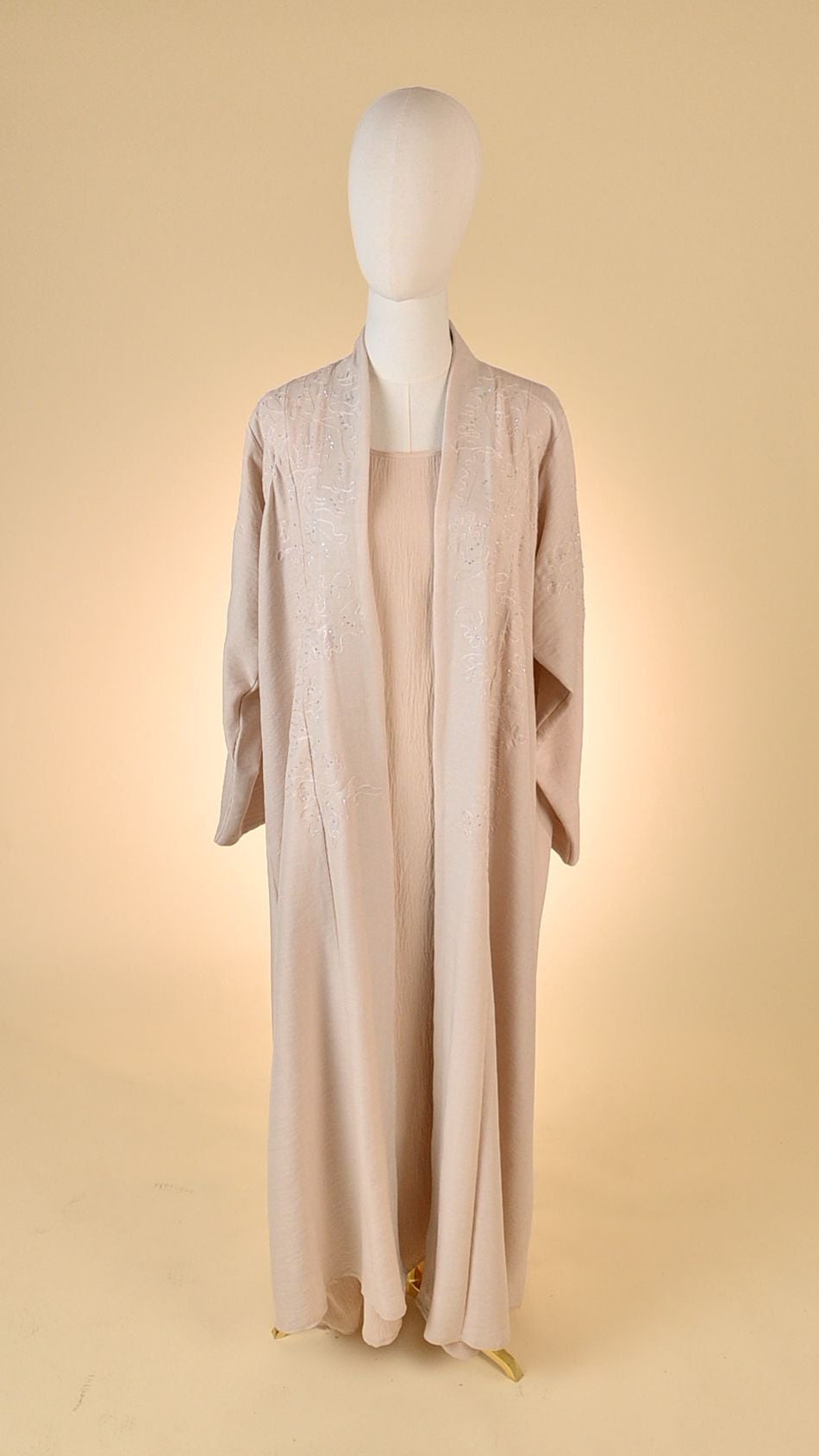 Experience effortless elegance with this complete three-piece ensemble, featuring a flowing open abaya, a matching sleeveless inner slip dress, and a coordinating hijab. The set is tailored from a premium beige linen-blend fabric, known for its breathable and lightweight feel. Intricate tonal floral embroidery and subtle beadwork detail the lapels, adding a touch of sophisticated shimmer to the modest silhouette.